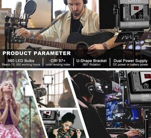 GVM 560 è un pannello LED professionale, un kit di illuminazione video con un corpo sottile in alluminio aeronautico, leggero e semplice.